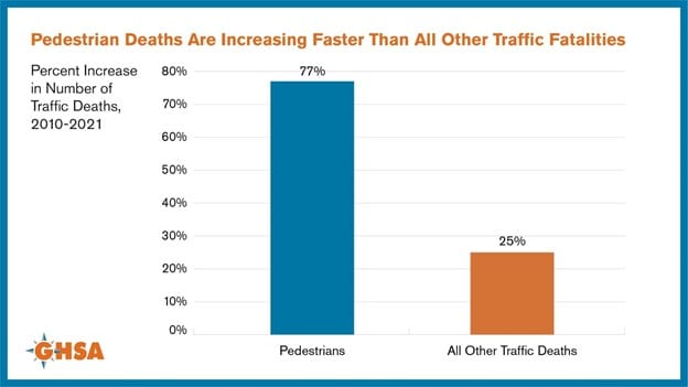 Cars on the road hit and killed some 7,508 pedestrians in 2022. That figure represents the most pedestrian deaths our nation has seen since 1981, according to the GHSA report. This report also analyzed data from the National Highway Traffic Safety Administration (NHTSA) to uncover why pedestrian deaths from vehicle collisions are on the rise. The 77% increase since 2010 means that these are growing 3X faster than all other traffic-related deaths.