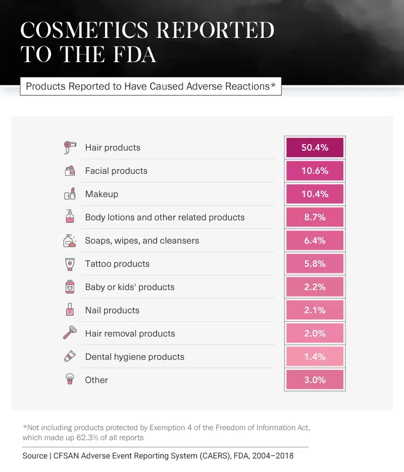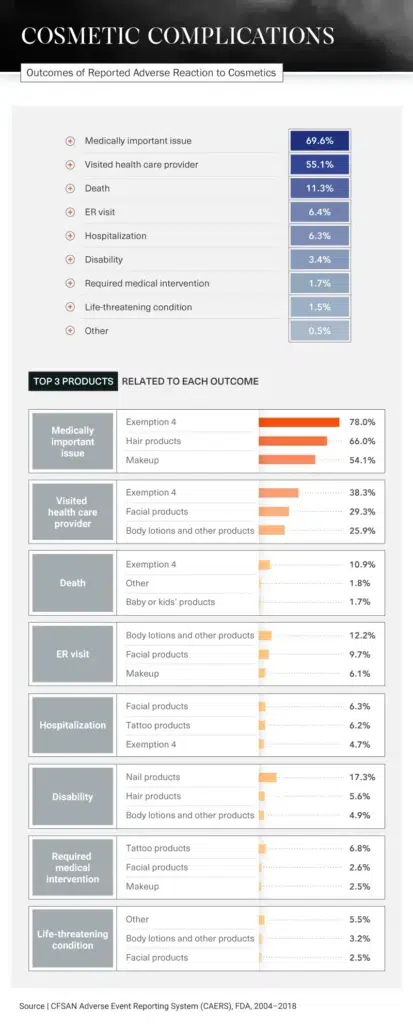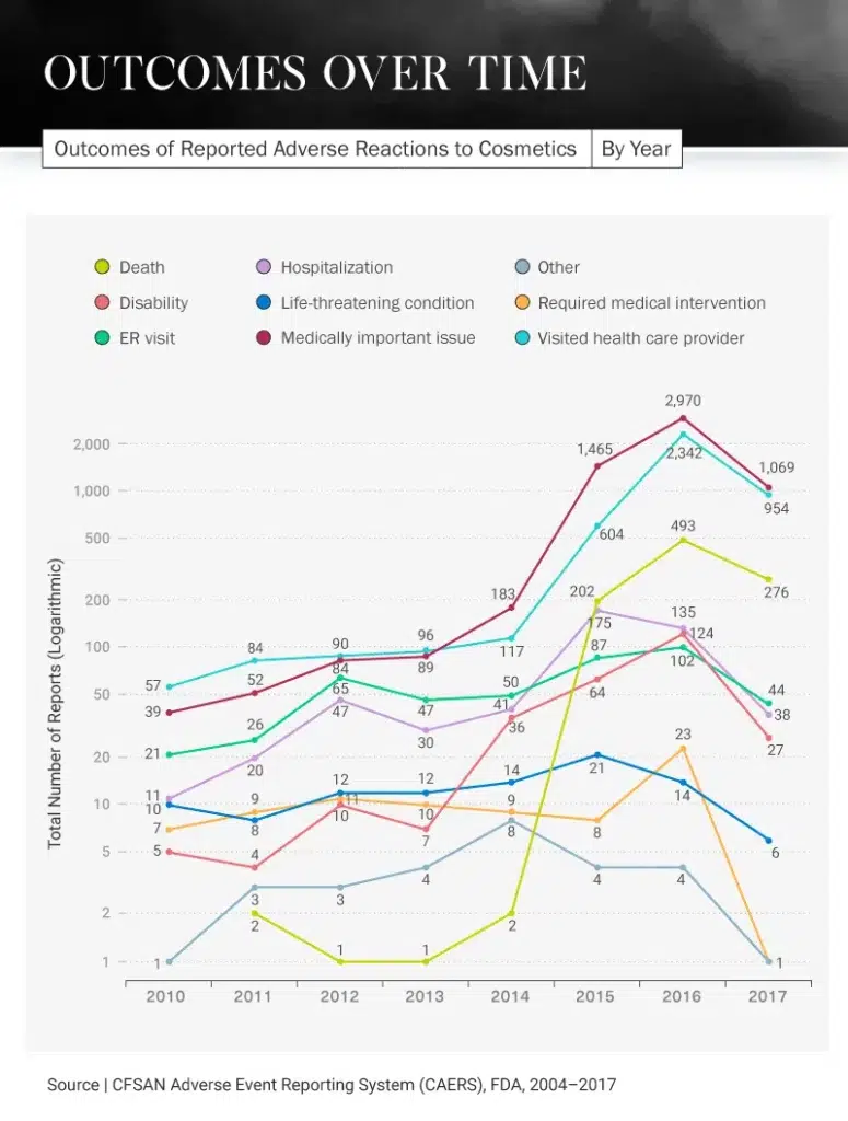 Different products cause different reactions, but many have had the same serious results: visits to the hospital or ER, disabilities, or in the most extreme situations, death. In fact, 11.3 percent of all incidents regarding cosmetic product side effects reported to the FDA between 2004 and 2018 ended with the person’s death. In more than half of all reports, the person involved had to visit a doctor.