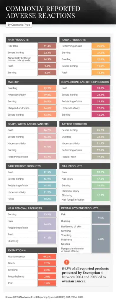 Unfortunately, our analysis shows that one of the most commonly reported side effects is also among the most severe. Out of all the product reports protected by Exemption 4, 84.3 percent showed that ovarian cancer was connected to the use of a particular cosmetic product.