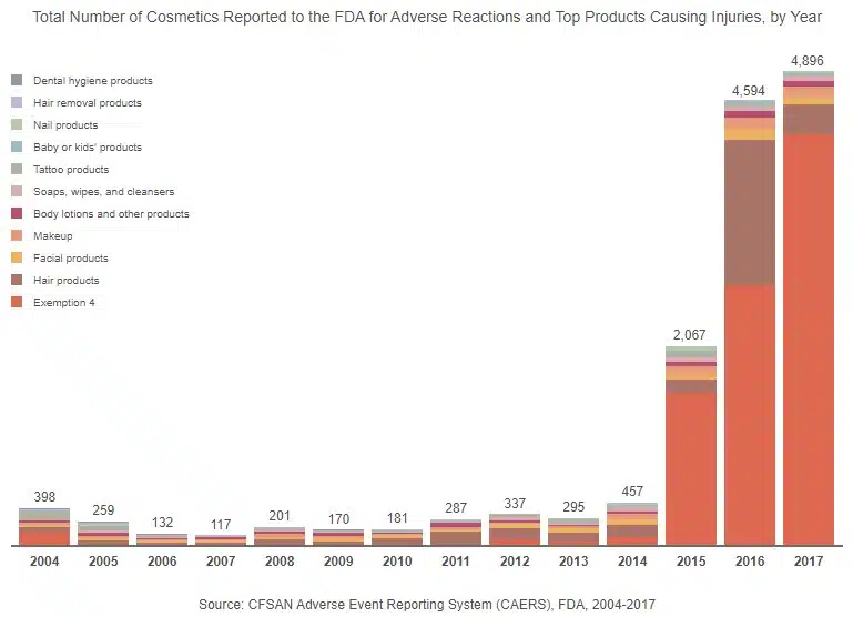 Still, it seems negative comments are often heard more loudly and clearly than those that are positive. Over the past 14 years, there have been many reports from consumers stating they have experienced injuries due to everything from hair products to toothpaste. Between 2004 and 2018, hair products had the most reports – not including reports that were hidden from the public due to Exemption 4 of the Freedom of Information Act (FOIA). The hair product category had the most reports by almost 40 percentage points.