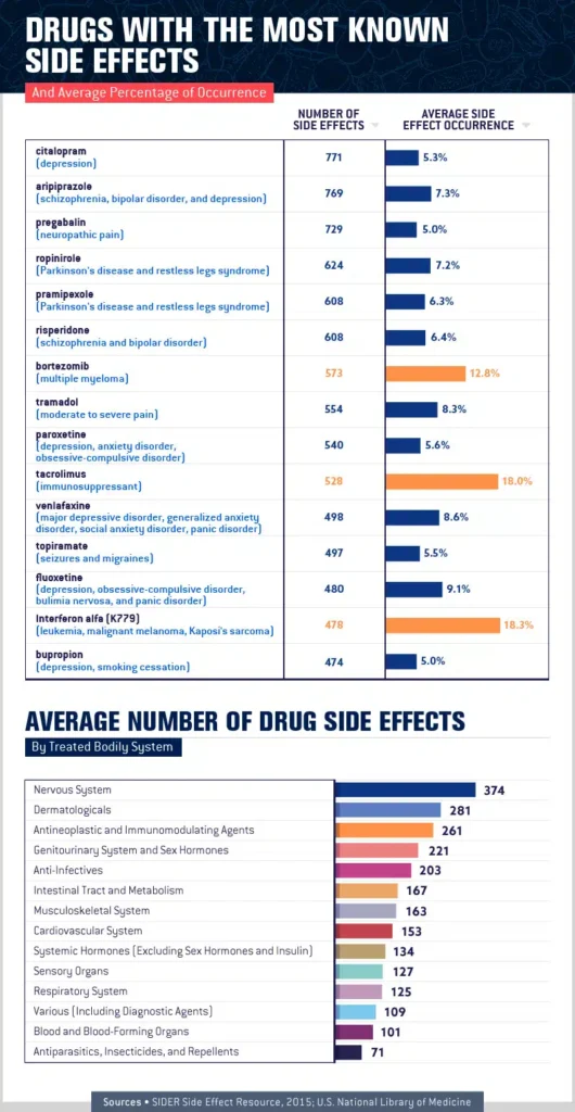 Medications that treat the nervous system, including common antidepressants, have the highest number of side effects. Citalopram, a selective serotonin reuptake inhibitor (SSRI) prescribed to treat depression, had 771 side effects, followed by aripiprazole, an antipsychotic used to treat schizophrenia and other psychiatric conditions.