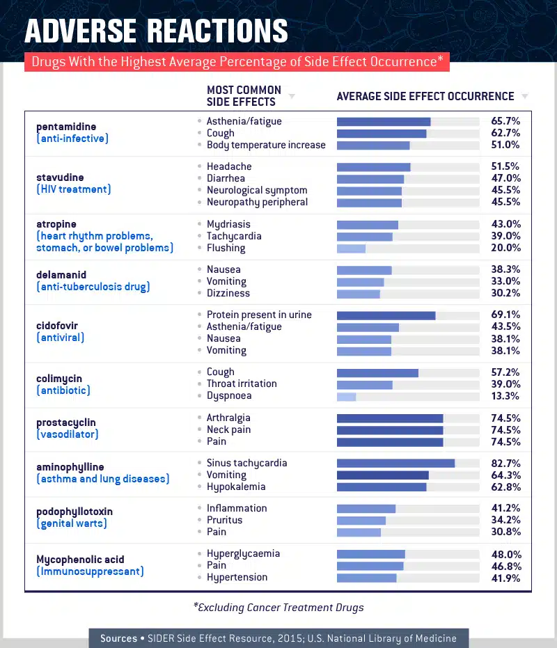 While the antiparasitic drugs had the fewest side effects, pentamidine – a drug used to treat pneumonia – had the most frequently occurring side effects on average.