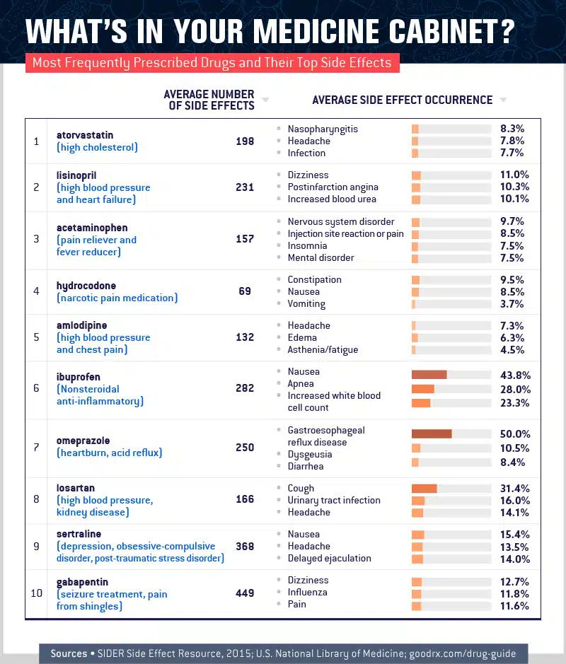 We don’t share these side effects to frighten you but rather to inform you of what can happen with various prescription and over-the-counter medications. Prescriptions have saved innumerable lives, but new research and studies show even life-saving drugs can come with serious drawbacks.