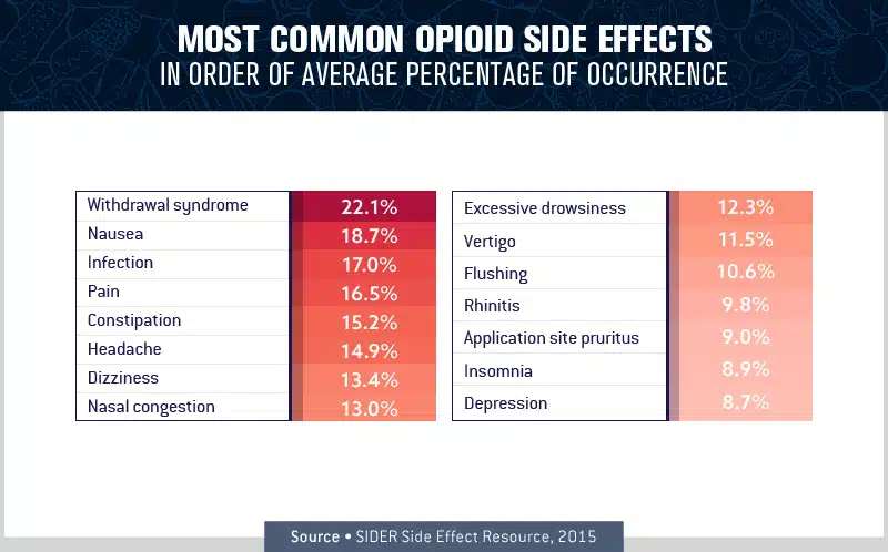 Adding to the common (and sometimes severe) opioid side effects like nausea and constipation are the withdrawal effects. Over 1 in 5 patients under medical supervision experienced withdrawal symptoms when taking opioids.