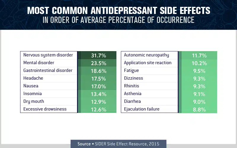 Antidepressants have also been involved in high-profile lawsuits. Considering that the top side effect of some antidepressants is nervous system disorders (which include disorders of the brain, spinal cord, cranial and peripheral nerves, nerve roots, nervous system, and neuromuscular system), these medications may have serious consequences for patients.