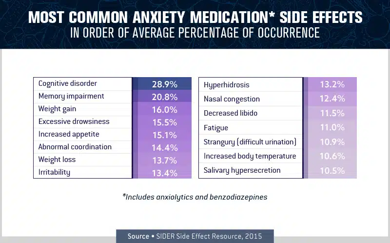 Anxiety medications, including anxiolytics and benzodiazepines, may also come with side effects that range from salivation to more severe issues like cognitive and memory disorders.
