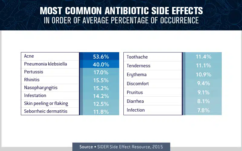 The most common side effect of taking certain antibiotics was acne at over 53 percent. However, the next most common side effect is a type of pneumonia.