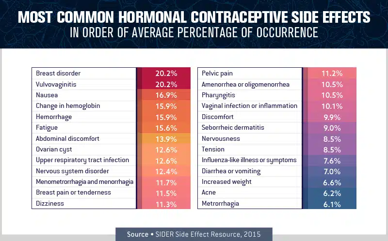 According to the SIDER data, about 12 percent of people using one of four forms of hormonal birth control experienced nervous system disorders or ovarian cysts. Additionally, a recent Danish study found a connection between hormonal contraception and depression, but this connection is still up for debate in the medical community.